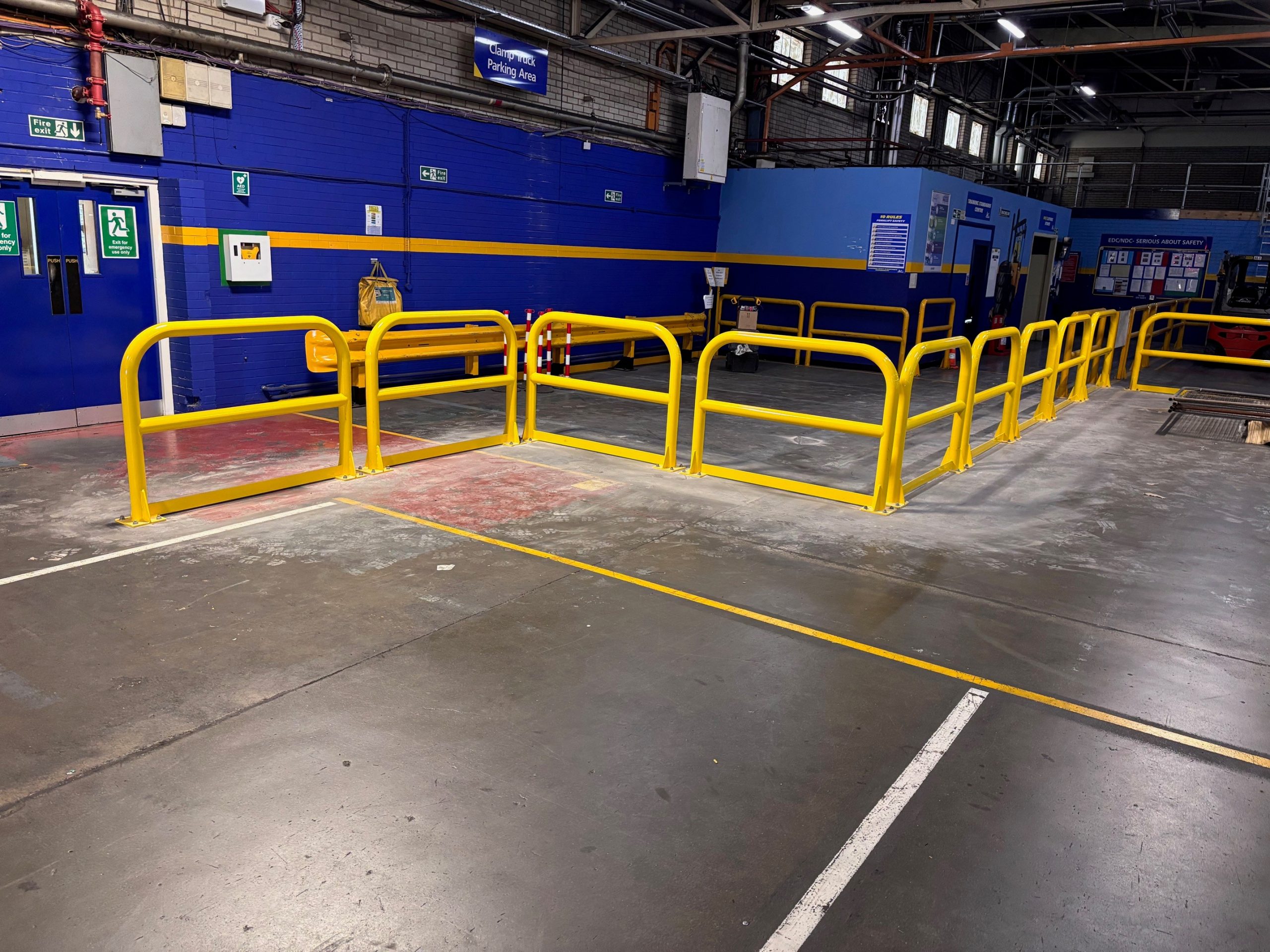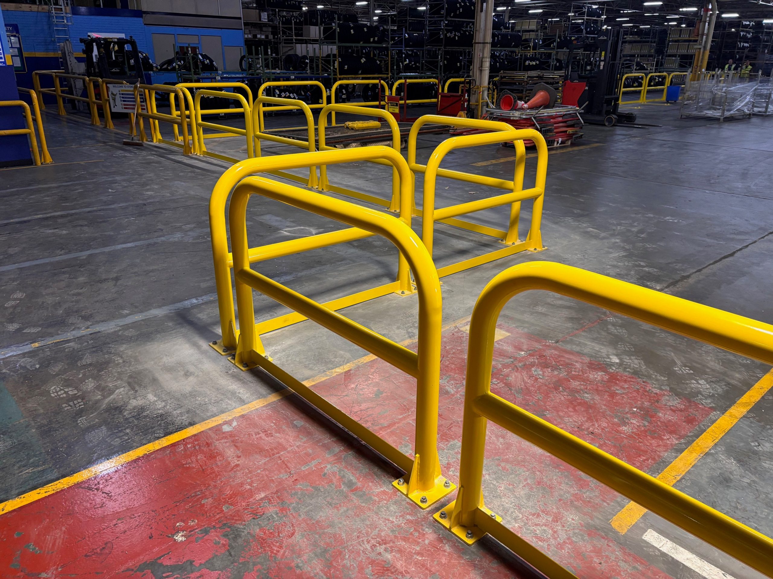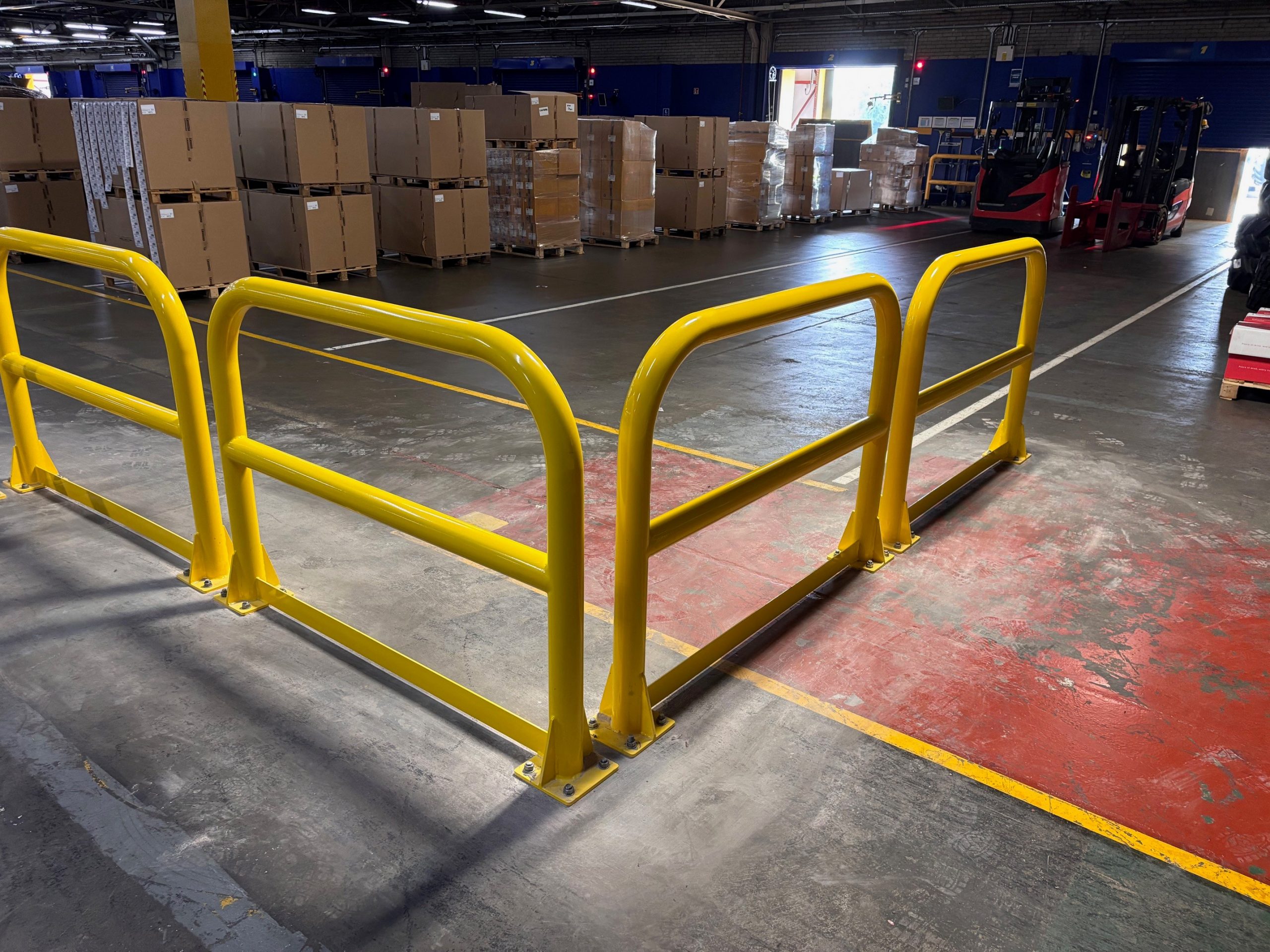 Steel barriers, powder coated yellow manufactured and installed by D-Fabs Ltd.